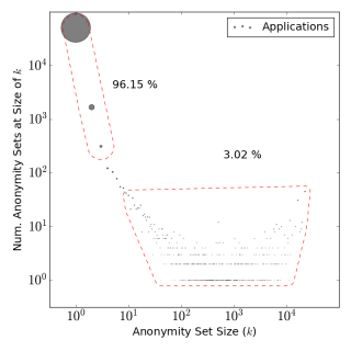 We calculated the targeted fingerprint for each user in our dataset, and on average, 2.3 applications were enough to construct the fingerprint. While these fingerprints were not always pointing to a single user, in most cases (96.15%) a fingerprint characterized at most three users. (Note: a fingerprint is not necessarily unique; if there are two users, for example, who are only distinguished by four applications, those four apps are going to be their fingerprint.) We checked if the protection scheme is viable but the problem is with the constraint (limit number): with decreasing the app detection limit to 2 applications, still most (85.54%) users were almost uniquely characterizable with fingerpints. This clearly shows that the fault is in the concept, not in the setting.
