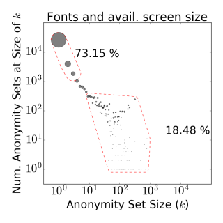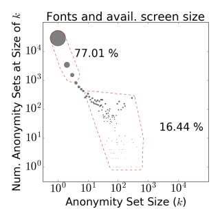 The targeted fingerprinting attack presumes that an attacker is looking for someone with a know identity, where the browser fingerprint data was also previously collected (check out the attack setup here). While the font set alone would do little harm (but still less then 40% are almost unique), if we consider including the available screen size, then the majority (77%) becomes almost uniquely identifiable with fingerprints. (Also giving an insight why TBB yields an alert when you maximize the window.)